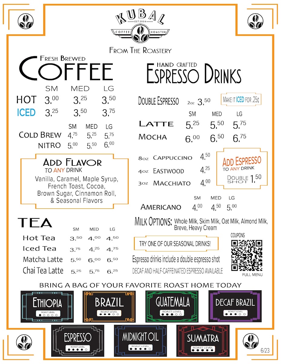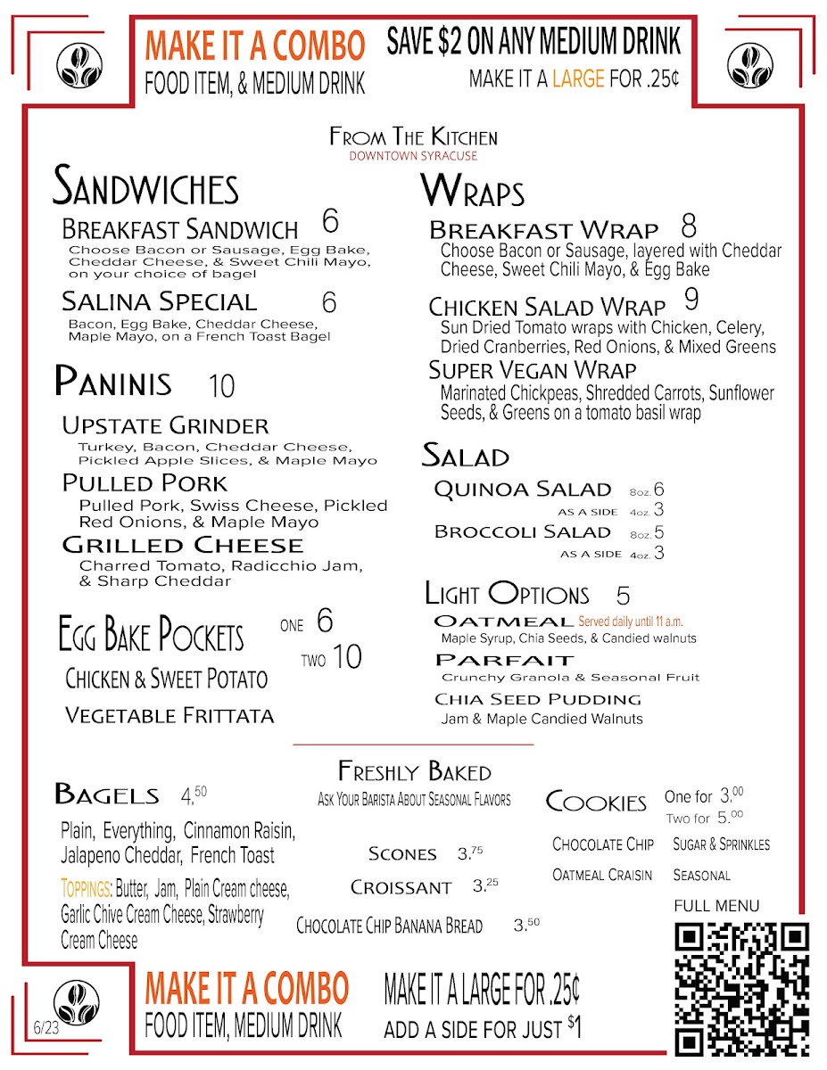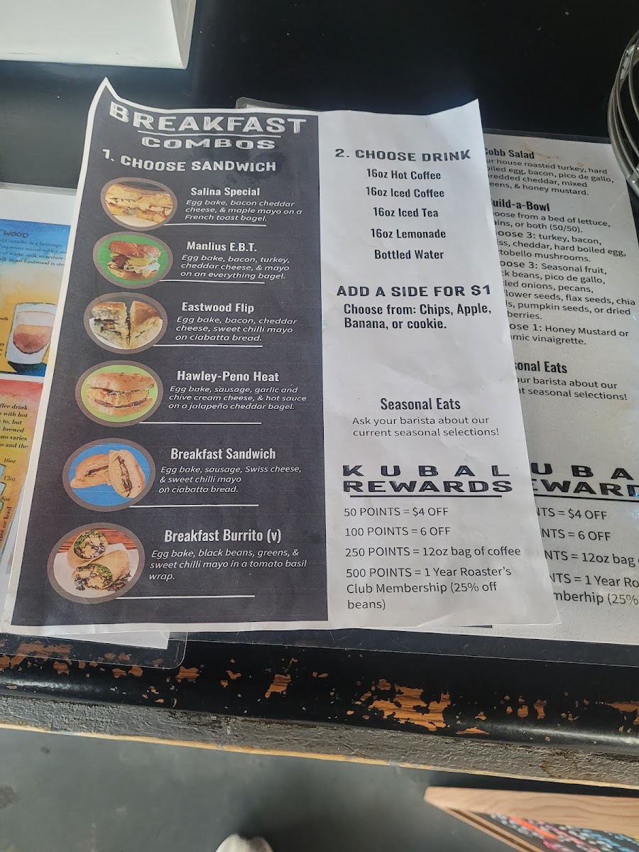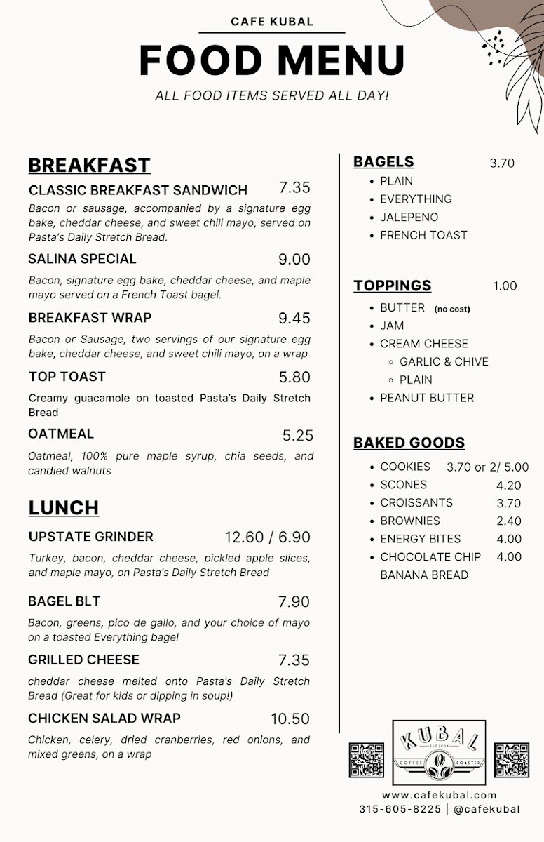 From a reviewer’s perspective, the menu at Cafe Kubal on W Water Street leaves a strong and satisfying final impression thanks to its thoughtful balance of simplicity, comfort, and quality. The breakfast selection sets the tone with familiar yet well-executed choices like the CLASSIC BREAKFAST SANDWICH, the heartier SALINA SPECIAL, and the versatile BREAKFAST WRAP, all ideal for starting the day on the right note. Lighter options such as OATMEAL and indulgent treats like FRENCH TOAST help round out the morning offerings. Bagel lovers are well cared for with staples including PLAIN, EVERYTHING, and JALEPENO bagels, customizable with spreads like BUTTER, JAM, and CREAM CHEESE in both PLAIN and GARLIC & CHIVE varieties. The baked goods section-featuring COOKIES, SCONES, CROISSANTS, BROWNIES, and ENERGY BITES-adds an inviting, grab-and-go charm that pairs perfectly with coffee. When lunchtime arrives, the menu smoothly transitions into satisfying savory options such as the UPSTATE GRINDER, BAGEL BLT, GRILLED CHEESE, and CHICKEN SALAD WRAP, offering something for both quick bites and more filling meals. Overall, Cafe Kubal’s menu feels cohesive and reliable, making it easy to understand why it appeals to both regulars and first-time visitors looking for quality café fare without unnecessary complexity.